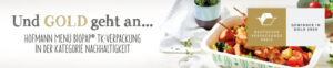 Die Menü-Manufaktur Hofmann aus dem baden-württembergischen Boxberg, qualitäts-führender Verpflegungsspezialist für alle Bereiche der modernen Gemeinschaftsverpflegung, gewinnt in der Kategorie Nachhaltigkeit den Gold-Award des Deutschen Verpackungspreises 2020. Die Auszeichnung wird jährlich vom Deutschen Verpackungsinstitut (dvi) verliehen. Mit der BIOPAP®-Menüschale, der hitze- und kältebeständigen Verpackung, die Ababaubar und Kompostierbar ist, konnte der Hersteller von tiefkühlfrischen Menüs die Jury überzeugen.