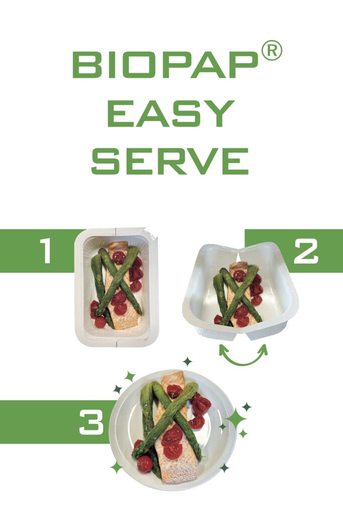 BIOPAP® EasyServe est une solution innovante d’emballage alimentaire compostable, conçue pour les plats cuisinés liaison Froide & liaison Surgelée et les applications premium de la restauration professionnelle. Doté d’un système breveté de barquette à ouverture par le fond, EasyServe permet une véritable expérience « directement à l’assiette », alliant durabilité, efficacité opérationnelle et présentation alimentaire de haute qualité.