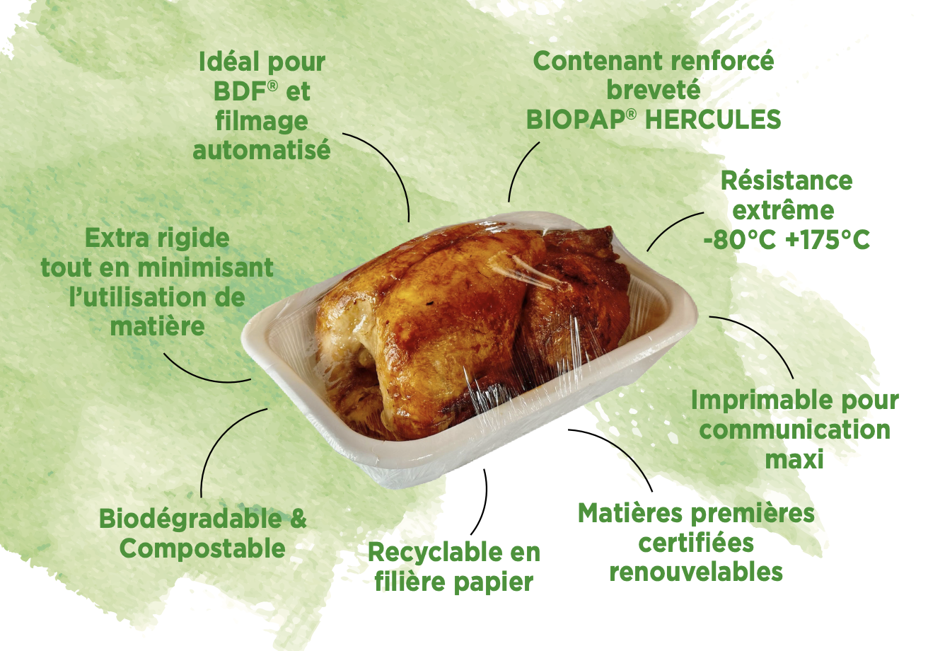 Un seule barquette alimentaire brevetée, à base-papier, pour tous les processus de conditionnement en magasin et industriels tels qu’en film étirable, en flow-packing et en film rétractable. Conçu pour les préparations alimentaires fraiches destinées à être vendus en libre-service en comptoirs réfrigérés ou chauffés. Les caractéristiques mécaniques spécifiques de BIOPAP® HERCULES améliorent l’hygiène et la présentation des aliments et contribuent à prolonger la durée de conservation et à réduire le gaspillage alimentaire avec les emballages sous film rétractable en Atmosphère modifiée.